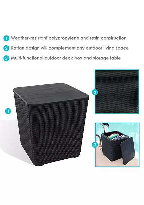 - SIZED TO FUNCTION AS A PATIO SIDE TABLE WITH STORAGE: The small outdoor storage bin measures 15.25″ square x 16.5″ H and weighs 6 lbs with a 110 lb weight capacity. Interior storage space is 13.5″ square on bottom, 15.25″ square on top and is 16″ H.