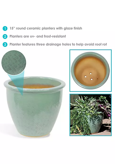 - LARGE MODERN CERAMIC PLANTER: Grow flowers, greenery, or herbs in this gardening pot. This patio ceramic pot has an outer size of 15″ top diameter (8.75″ bottom diameter) x 12″ H and an inner size of 12.75″ top diameter (8″ bottom diameter) x 11.5″ H. Each planter weighs 20.4 lbs and can hold up to 6.4 gallons/0.85 cubic feet/814 ounces of soil.