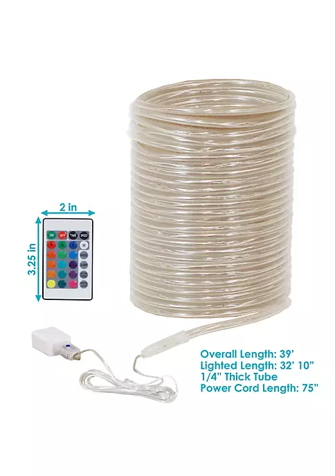 - DISCREET ILLUMINATION: The indoor LED rope light is 0.25″ thick, has a lighted length of 32.8′ (or 32′ 10″) and weighs 0.6 lbs. The power cord is 75″ L from the end of the lighted part to the USB plug. The light is 469″ L (or 39′) including the lighted part and the power cord. The LEDs are 4″ apart. Adapter is 2.25″ D (including prongs) or 1.5″ D (sans prongs) x 1.25″ W x 1″ thick. LEDs have a brightness of 2 lumens and lifespan of 20,000 hours max. Remote is 2″ W x 3.25″ D x 0.25″ thick.