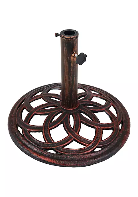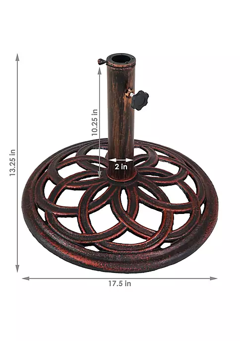 - INTRICATE AND DECORATIVE PATIO UMBRELLA STAND: 17.5 inches diameter x 13.25 inches tall; Weighs 17.2 pounds; Pole is 2 inches diameter x 10.25 inches tall; Can be placed under a patio table with a through-table umbrella hole