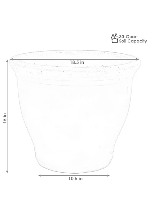 - OVERALL DIMENSIONS: 18.5 inches outer top diameter (16.5 inches inner diameter); 10.5 inches outer base diameter (8 inches inner base diameter) x 15 inches tall (14 inches tall inner); Weighs 35 pounds; (4) 1-inch drainage holes; Soil capacity: 30 quarts/7.4 gallons
