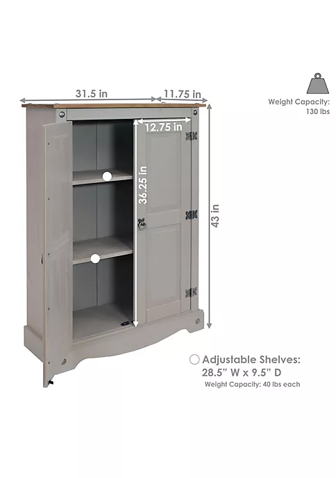 - PROVIDES PLENTY OF STORAGE: This storage cupboard measures 31.5″ W x 11.75″ D x 43″ H and weighs 40 lbs. It has an overall weight capacity of 130 lbs and has two adjustable 28.5″ W x 9.5″ D interior shelves. Each shelf has a weight capacity of 40 lbs. Each door measures 12.75″ W x 36.25″ H x 0.5″ thick.