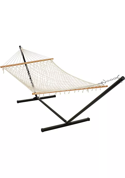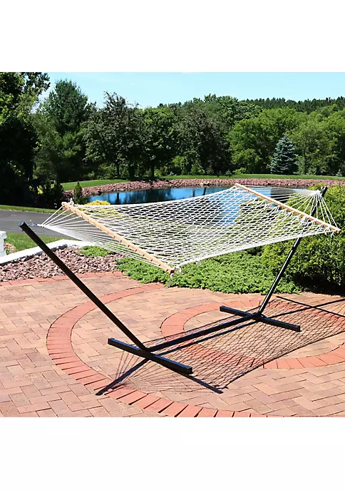- HAMMOCK ACCOMMODATES 2 PEOPLE: Large free standing hammock measures 136 inches long x 51 inches wide from loop to loop; Hammock bed: 82 inches long x 48 inches wide; Hammock weighs 10 pounds and has a 350 pound weight capacity