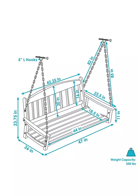 - 2-PERSON PORCH SWING: The bench of this hanging porch swing measures 47″ W x 26″ D x 23.75″ H overall and has a 42.25″ W x 1.75″ D x 16″ H back. Each armrest is 2.5″ W x 23.5″ D x 11″ H. The swing weighs 31.8 lbs and can support up to 350 lbs. Each hanging chain is 85″ L in the front and 82″ L in the back and includes a 5″ L hook.