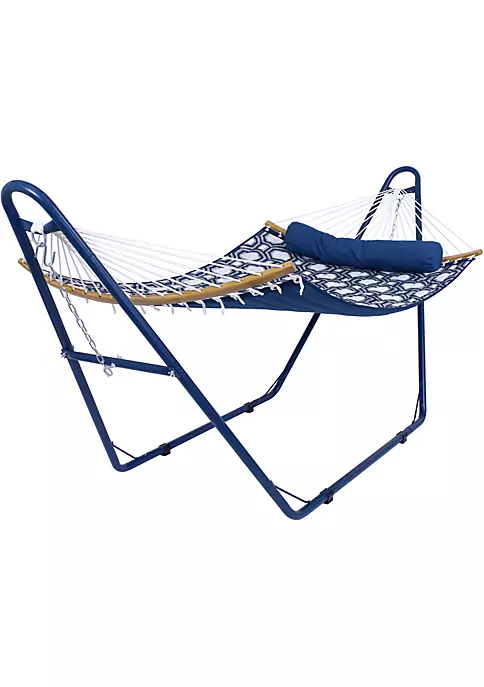 - PERFECT SIZE: Hammock is 55 inches wide x 132 inches long x 7 inches tall; Weighs 10.2 pounds; 450-pound weight capacity; Hammock bed is 55 inches wide x 74 inches long; Includes a 6-inch diameter x 36-inch long tie-on bolster pillow; Stand is 124 inches long x 40 inches wide x 52.5 inches tall; With the included chains and hardware this stand will fit hammocks ranging from 9.5 feet to 14 feet long; Weight capacity is 450 pounds; Stand weighs approximately 25 pounds