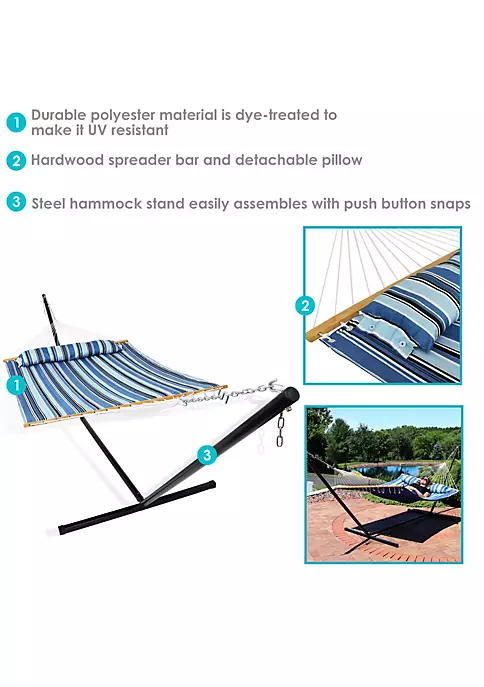 - FITS TWO PEOPLE: Large freestanding hammock measures 130 inches long x 55 inches wide; Hammock bed size: 74 inches long x 55 inches wide; Hammock pillow: 40 inches long x 10 inches deep x 3.5 inches tall; Weighs 7.4 pounds