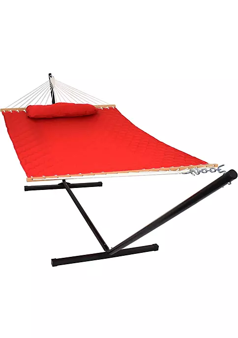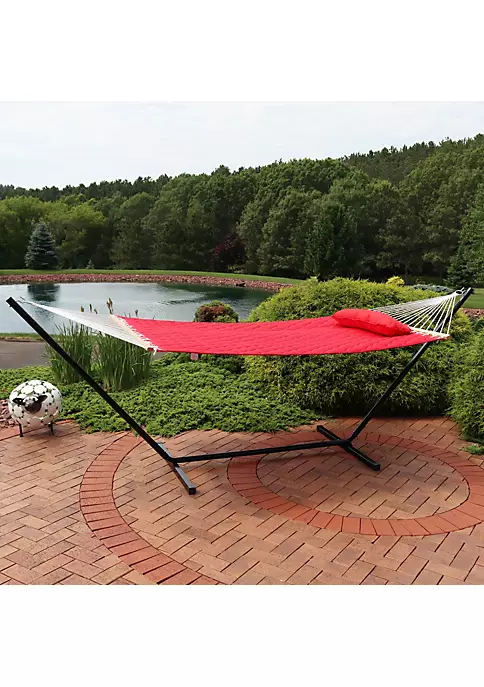 - FITS TWO PEOPLE: 132″ L x 55″ W from loop to loop; Includes chains; Hammock pillow: 32″ L x 12″ D x 5″ H; Hammock bed size: 76″ L x 55″ W; Weight capacity of 350 pounds