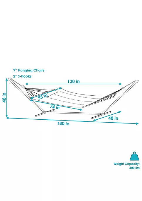 - SPACE SAVING SIZE: Outdoor hammock is 141 inches long x 55 inches wide from loop to loop; Bed size is 74 inches long by 55 inches wide; Weighs 11 pounds and has a weight capacity of 400 pounds