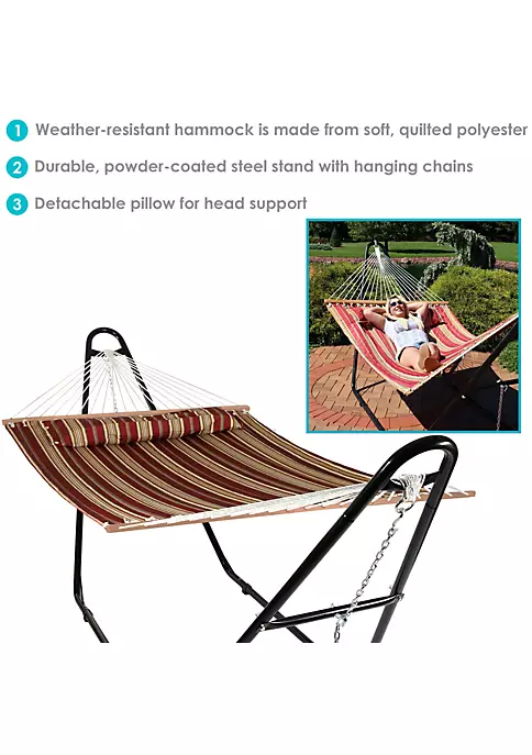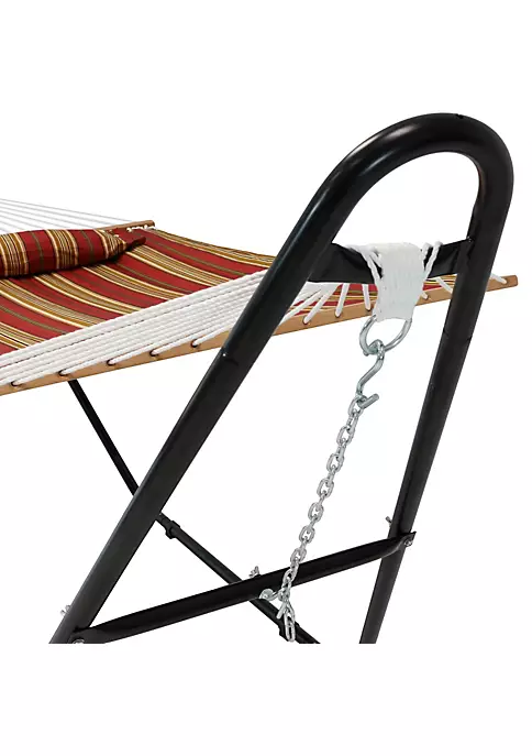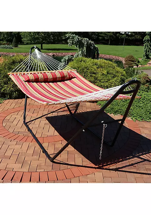 - LARGE ENOUGH FOR TWO PEOPLE: This large freestanding quilted hammock with stand measures 124 inches long and 55 inches wide. The overall stand dimensions are 124 inches long, 40 inches wide, and 52.5 inches tall. With the included chains and hardware, this stand will fit hammocks ranging from 9.5 feet to 14 feet long. The weight capacity is 440 pounds. with the frame weighing approximately 25 pounds. The overall weight of the hammock and stand is a combined 33 pounds.