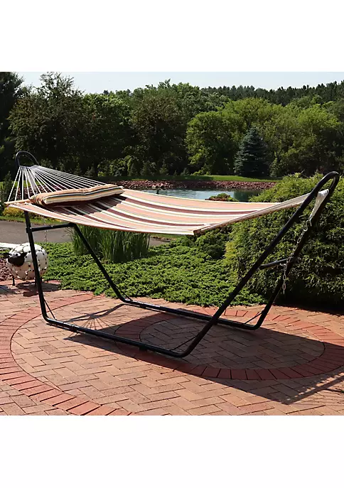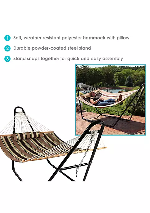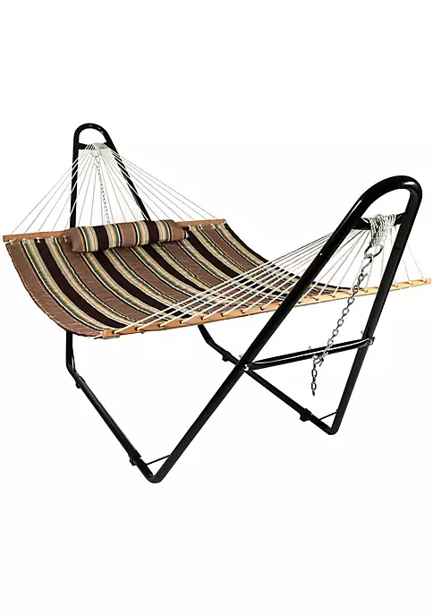 - LARGE ENOUGH FOR TWO PEOPLE: This large freestanding quilted hammock with stand measures 124 inches long and 55 inches wide. The overall stand dimensions are 124 inches long, 40 inches wide, and 52.5 inches tall. With the included chains and hardware, this stand will fit hammocks ranging from 9.5 feet to 14 feet long. The weight capacity is 440 pounds. with the frame weighing approximately 25 pounds. The overall weight of the hammock and stand is a combined 33 pounds.
