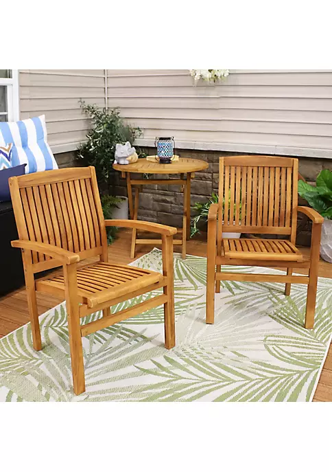- OVERSIZED OUTDOOR STACKABLE CHAIRS: These patio wood chairs provide a comfortable place to sit in any outdoor area. Each chair measures 24.25″ W x 23″ D x 36″ H overall and weighs 20.4 lbs each. Each armrest measures 1.75″ W x 21.25″ D x 26″ H off the ground with 20.5″ between each armrest. The chair back is 19.75″ W x 1.75″ D x 21.5″ H, while the seat measures 16.5″ W x 20.5″ D x 17.5″ H. These outdoor chairs accommodate most adults with their 350 lb weight capacity.