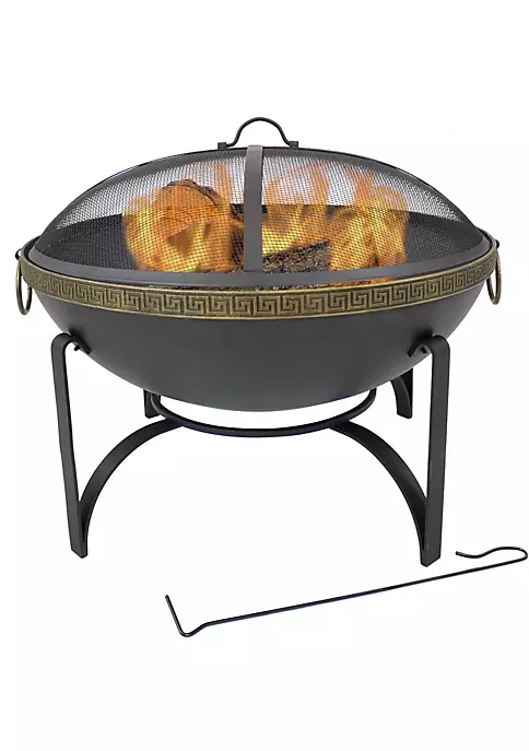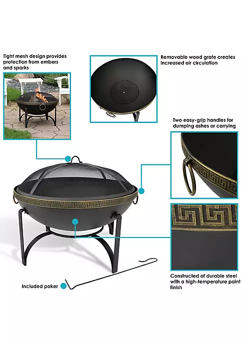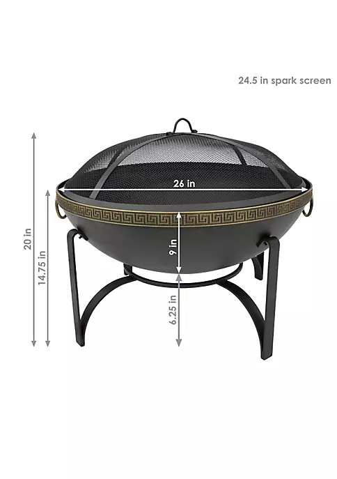 - PERFECT SIZE FOR THE PATIO: 26 inches diameter x 20 inches tall (with spark screen on) or 14.75 inches tall (without spark screen on); Fire bowl is 26 inches diameter x 9-inch bowl depth; Fire bowl sits 6.25 inches off the ground; 24.5-inch diameter spark screen; 12-inch diameter log grate; 21-inch long log poker; Fire pit weighs 21.2 pounds