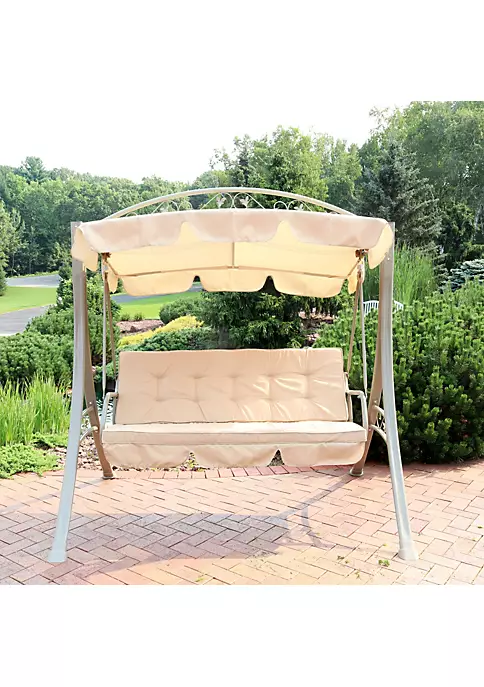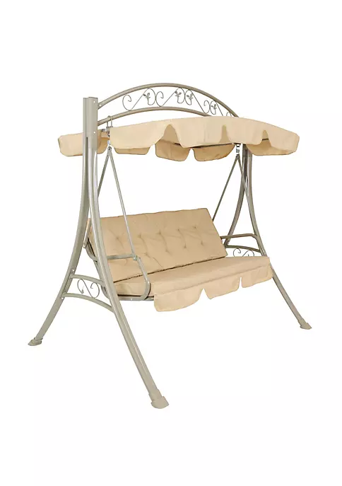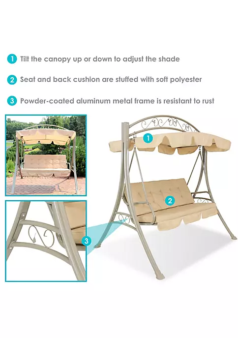 - COMFORTABLE OUTDOOR SITTING SPACE: Porch loveseat swing is perfect for relaxing comfortably with a friend or loved one. Swing measures 75″ L x 55″ W x 75″ H overall and weighs 85 lbs. It can support up to 600 lbs and has a 57″ L x 19″ W x 24.5″ H seat. The back rest is 20.5″ H with a 58″ L x 19″ W x 3″ H comfortable seat cushion. The backrest cushion is 58″ L x 20″ W x 3″ H. The armrests are 18″ L x 1.5″ W. The adjustable canopy is 64″ L x 44″ W with a 7″ overhang.