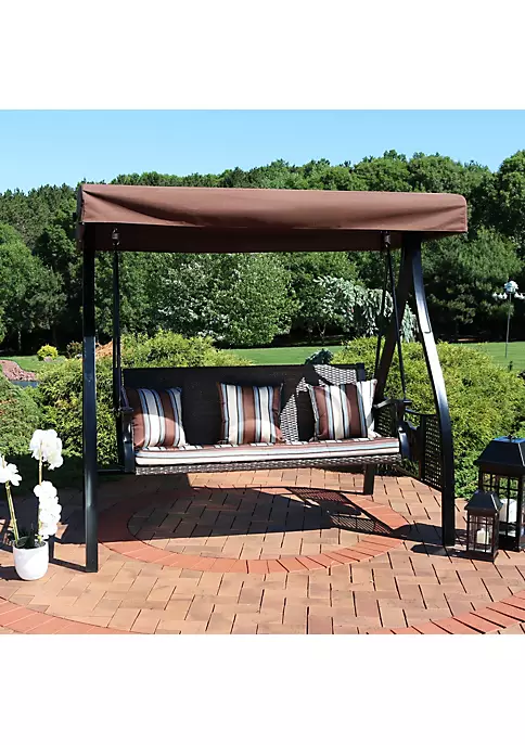 - PLENTY OF SITTING SPACE: Porch swing measures 90 inches wide x 44 inches deep x 74 inches tall; weighs 140 pounds; Large weight capacity of 600 pounds; Swing seat dimensions: 55 inches wide x 23 inches deep x 21 inch back cushion height, seat height: 22 inches; Canopy dimensions: 77 inches wide x 45 inches deep with a 7 inch overhang