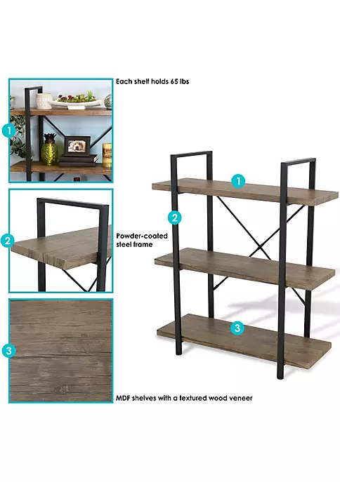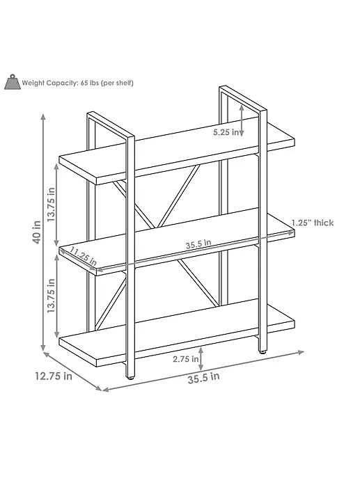 - LARGE DISPLAY AND STORAGE AREA: 35.5 inches wide x 12.75 inches deep x 40 inches tall; Weighs: 24.8 pounds; Shelf size: 35.5 inches wide x 11.25 inches deep x 1.25 inches thick; Shelf capacity: 65 pounds per shelf; Shelf-to-shelf clearance: 13.75 inches; Ground clearance: 2.75 inches; Top shelf to frame: 5.25 inches