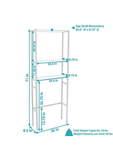 - IDEAL VERTICAL STORAGE: 26 inches wide x 8.5 inches deep x 71 inches tall; Weighs 16 pounds; 20-pound weight capacity per shelf; Shelves are 24.5 inches wide x 8.75 inches deep x 0.5 inches thick; Ground to bottom shelf clearance: 36.75 inches tall; Bottom to middle shelf clearance: 11.25 inches tall; Middle to top shelf clearance: 20.75 inches tall; Clearance from ground to bottom of decorative bar: 13.75 inches tall