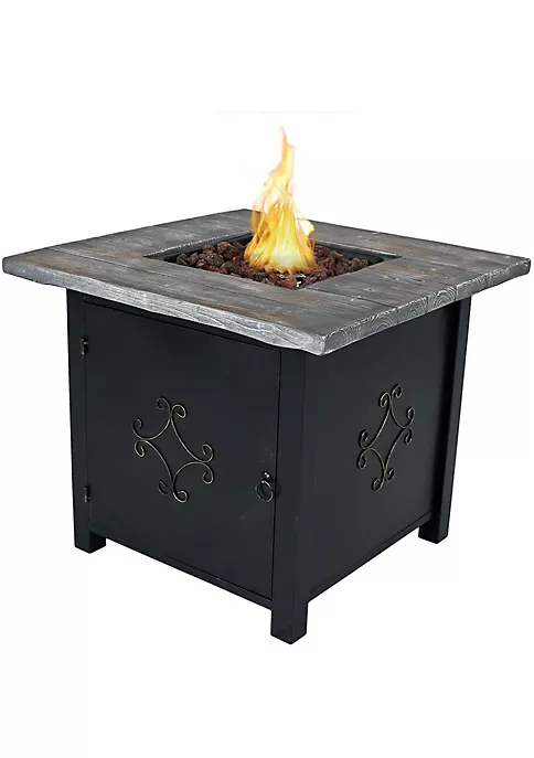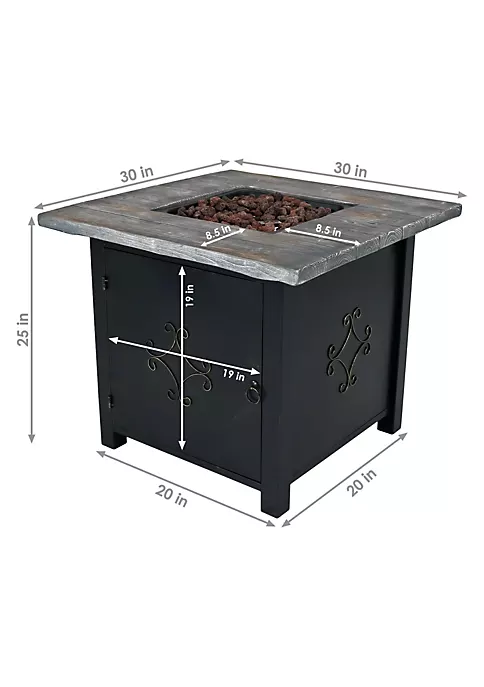 - BEAUTIFUL FIRE TABLE: 30 inches square x 25 inches tall; 13-inch square fire area; 66 pounds; Base interior size: 20 inches wide x 20 inches deep x 20 inches high; Door dimensions: 19 inches wide x 19 inches tall; Puts out 40000 BTUs of heat