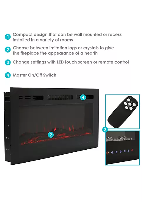 - Fireplace;Wall Mounting Hardware;Remote Control;Pack of Crystals;Faux Log Set