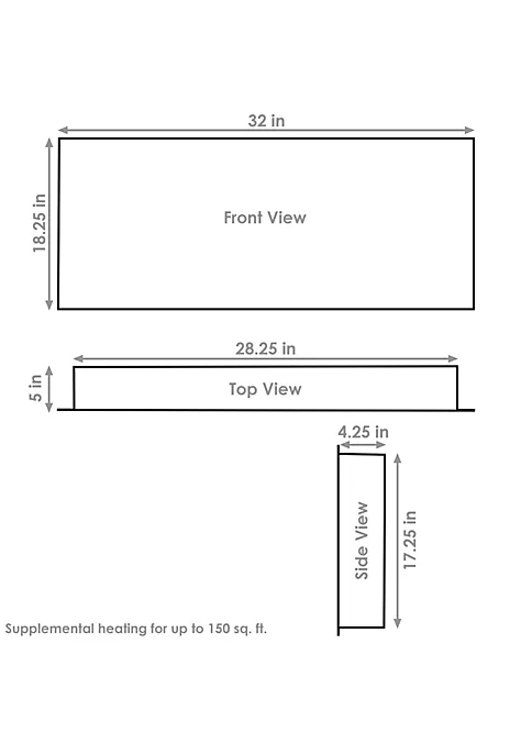 - OVERALL DIMENSIONS: Overall Dimensions: 32 inches wide x 5 inches deep x 18.25 inches tall; Insert: 28.25 inches W x 4.25 inches D x 17.25 inches tall; Weighs 34.4 pounds; BTU output: 5,120 BTUs; Heat Settings: 750 W – 1500 W; Amps: 12.5; Volts: 100-127; Cord length: 72 inches; Provides supplemental heating for up to 150 square feet