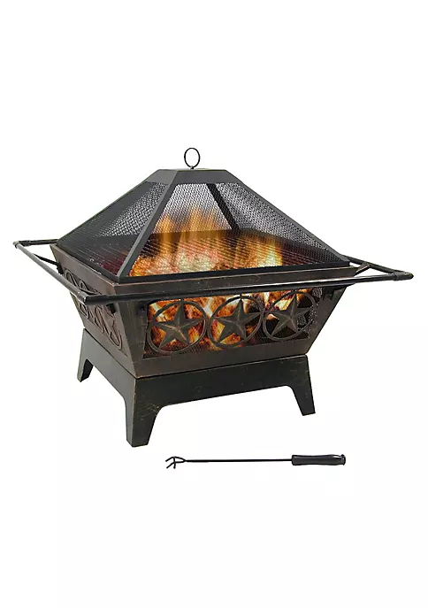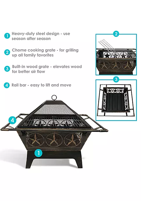 - LARGE SIZE FOR EXTRA AMBIANCE AND WARMTH: Overall 32 inches square x 26 inches tall; weighs 30 pounds; Steel fire bowl is 25 inches square x 9.5 inches deep; Weight limit of the cooking grill is 40 pounds; Concentrated weight limit of the cooking grill when folded in half is 20 pounds