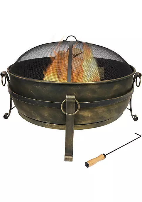 - LARGE SIZE: This steel cauldron fire pit is a great size to fit many people around a bonfire on the patio, in the backyard, or at the campground. The fire pit measures 34″ diameter x 23″ H overall and weighs 28 lbs. The backyard bonfire pit is 16″ H without the spark screen. The bowl of the fire pit is 34″ diameter x 10″ H, while each of the three legs are 6″ H.
