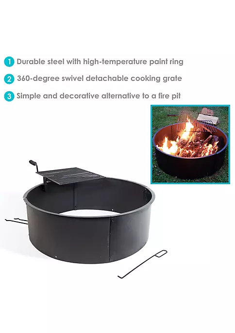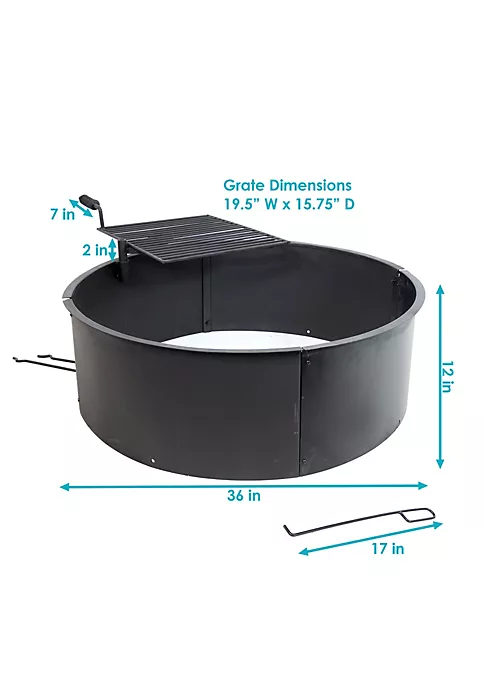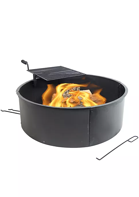 - FIRE PIT KIT: Overall 36 inch diameter (34 inch inner) x 12 inches deep, weighs 41 pounds; Cooking grate is 19.5 inches long x 15.75 inches wide; Perfect size to enjoy a bonfire outdoors; Can be used alone or enhanced with landscape materials such as block, brick or stone (please note, landscape materials are not included with this product)