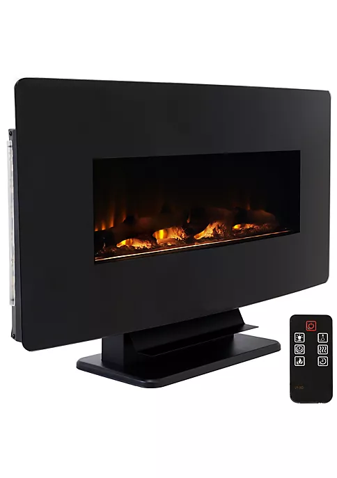 - STYLISH ELECTRIC FIREPLACE: This modern fireplace measures 35.75″ W x 8.75″ D with stand (4.5″ D when wall mounted) x 21.5″ H with stand (17.5″ H when wall mounted) and weighs 33.4 lbs. The remote measures 3.5″ H x 1.5″ W. The wall mount insert measures 32″ W x 3.5″ D x 14″ H. The base measures 16″ W x 8.75″ D x 0.75″ H. The overall BTU output is 4,777 BTUs, and it has 1,400 W. It requires 11.7 amps and has 120 volts. The cord length is 70″. It provides supplemental heating for up to 377 sq ft.