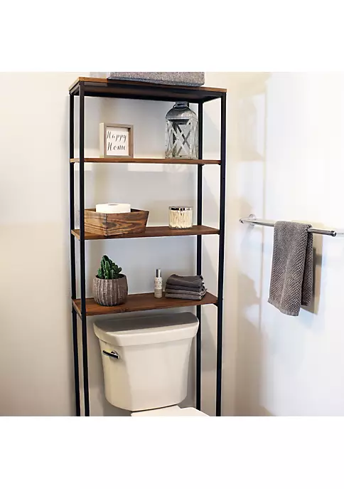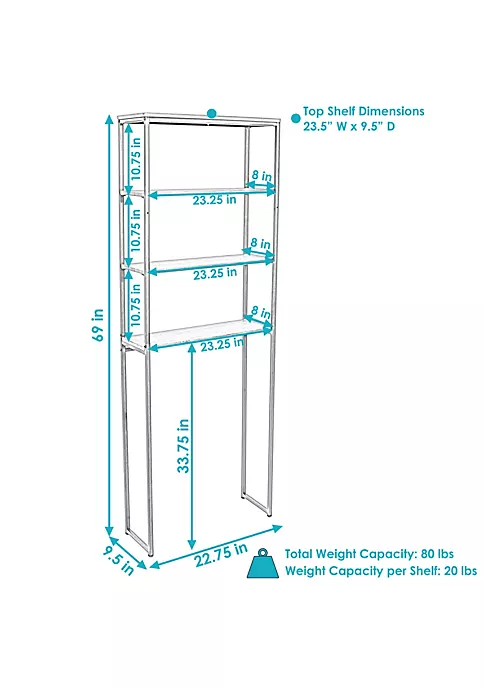 - SPACE-SAVING BATHROOM STORAGE: 22.75 inches wide x 9.5 inches deep x 69 inches tall; Weighs 18 pounds; 80-pound total weight capacity; 20-pound weight capacity per shelf; Bottom three shelves are 23.25 inches wide x 8 inches deep x 0.5 inches thick; Top shelf is 23.5 inches wide x 9.5 inches deep x 0.5 inches thick; 10.75 inches of clearance between shelves; Ground to bottom shelf clearance is 33.75 inches tall