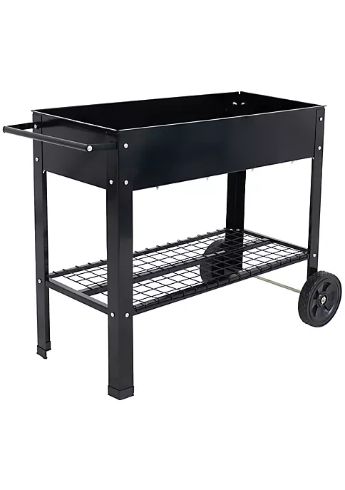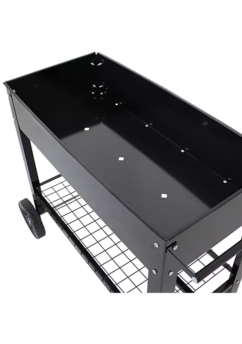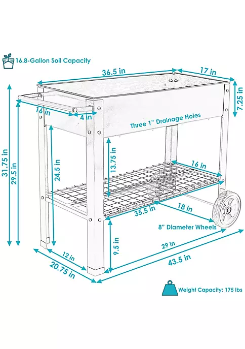 - GROW VEGETABLES AND PLANTS: Raised garden bed cart measures 43.5 inches long x 20.75 inches wide x 31.75 inches tall; Weighs 29 pounds; Planter area is 36.5 inches long x 17 inches wide x 7.25 inches tall; Inner planter: 35.25 inches long x 15.75 inches wide x 7 inches tall; Lower shelf is 35.5 inches long x 16 inches wide; 13.75 inches of space between the bottom shelf and planter area; Bottom shelf is 9.5 inches above the ground; Bottom of planter is 24.5 inches above the ground