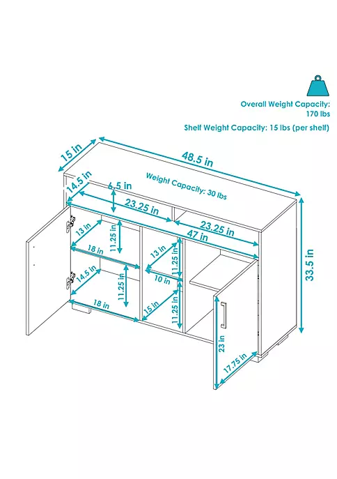 - AMPLE STORAGE SPACE: This modern buffet sideboard measures 48.5″ W x 15″ D x 33.5″ H overall, weighs 92.8 lbs, and has a 170-lb overall weight capacity. The top 2 shelves are 23.25″ W x 14.5″ D x 6.5″ H. The top middle shelf is 10″ W x 13″ D x 11.25″ H, and the bottom one is 10″ W x 15″ D x 11.25″ H. Each top cabinet shelf is 18″ W x 13″ D x 11.25″ H, and each bottom shelf is 18″ W x 14.5″ D x 11.25″ H. Each shelf can support up to 15 lbs. The top of the sideboard cabinet can hold up to 30 lbs.