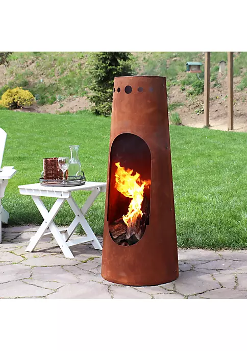 - PERFECT SIZE FOR PATIO: 19.75 inches diameter base x 12.5 inches diameter (top) x 50 inches tall; 1.3 mm thick steel; Weighs 32.6 pounds; Opening of chiminea is 26.75 inches tall x 11.25 inches wide; Bottom of interior of chiminea is 19 inches diameter; 17.75-inch diameter x 6mm thick log grate; Product includes 1 outdoor chiminea and 1 log grate