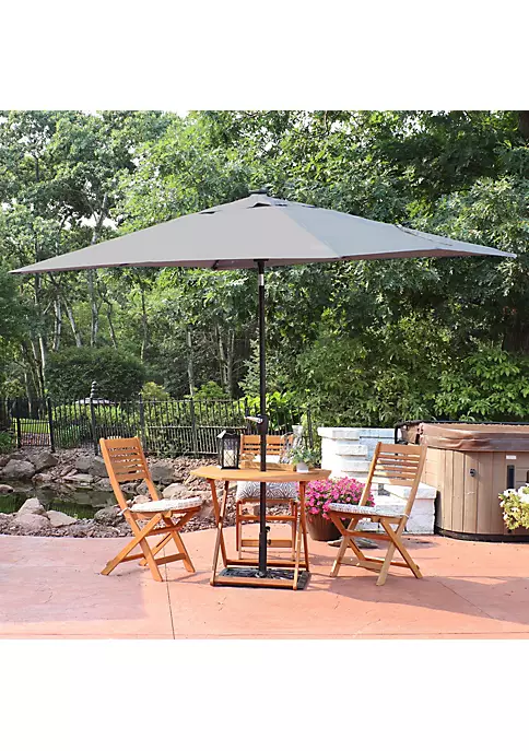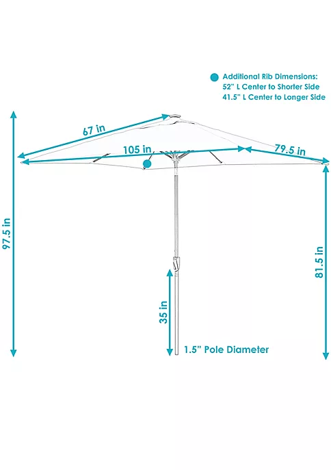 - ENJOY AMPLE SHADE ON PATIO: This outdoor umbrella is 105″ D x 79.5″ W x 97.5″ H and weighs 16.2 lbs. The edge of the umbrella is 81.5″ H off the ground, while the crank is 42″ H off the ground. The pole is 1.5″ Diameter. The four ribs that are diagonal are 67″ L. The 2 ribs that go from the center to the shorter sides of the umbrella are 52″ L. The 2 ribs that go from the center to the longer sides of the umbrella are 41.5″ L