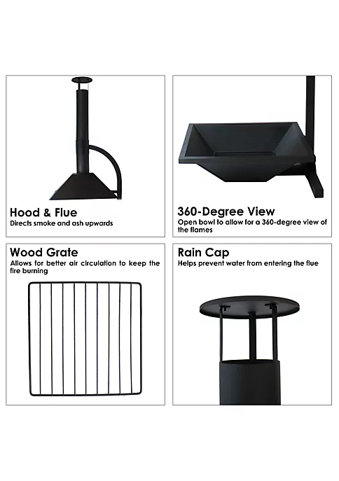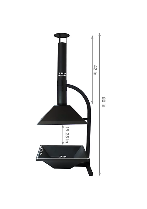 - MEDIUM SIZE: 29.5 inches wide x 32 inches deep x 82 inches tall; weighs 75 pounds; Fire pit bowl: 29.5 inches square x 9.5 inches deep that tapers into a 15.5-inch square cooking grate grill with 1.25 inches between each bar and sits 3.25 inches from the bottom of the bowl; 19.25-inch clearance between the fire pit edge and the chiminea; Flue: 5.75-inch diameter x 42 inches tall; Cap: 9.5-inch diameter