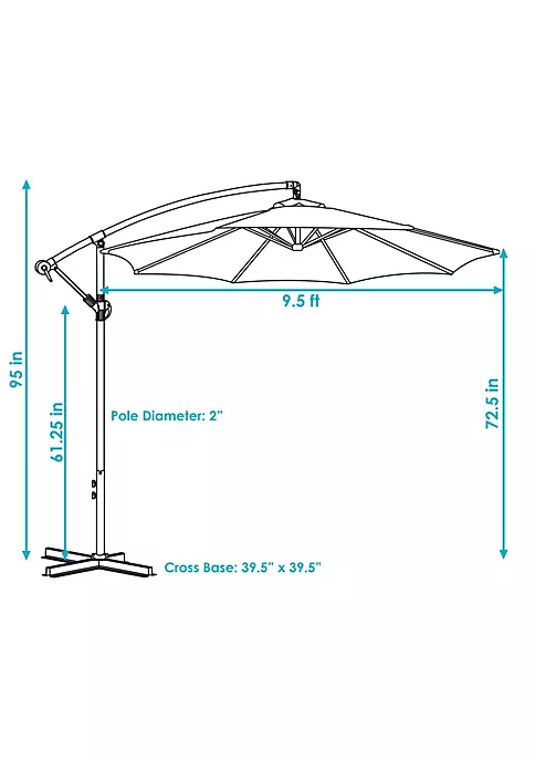 - IDEAL FOR BACKYARD OR PATIO: 2-inch pole diameter x 95-inch overall height x 9.5-foot umbrella diameter; Ground-to-crank height: 61.25 inches; Weighs 29.6 pounds; Cross base: 39.5 inches x 39.5 inches