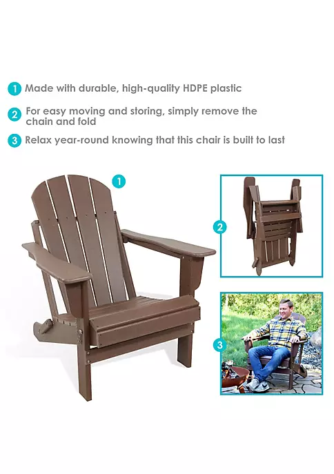 - COMFORTABLE FIT: This lightweight, foldable Adirondack chair weighs 35.2 lbs and has a weight capacity of 300 lbs. This chair measures 29.5” W x 31” D x 34.5” H. The tall back, wide seat, and long armrests are sure to fit all sizes perfectly with a relaxed feel. The seat measures 20.5″ W x 20″ D and the seat back measures 30″ H.