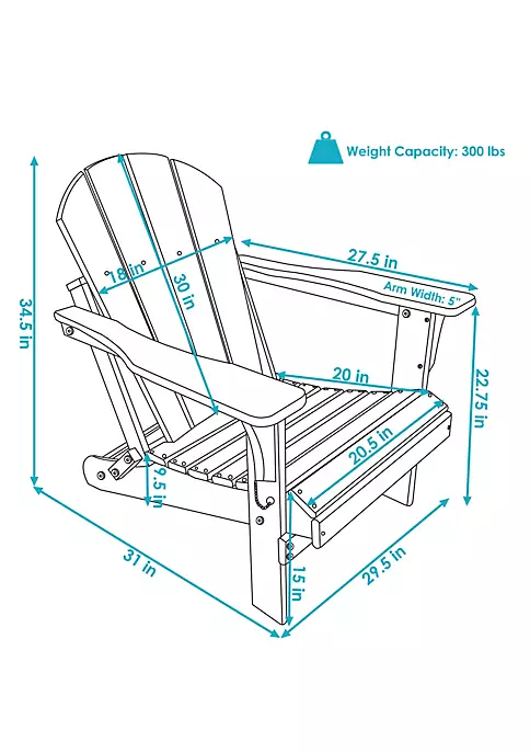 - COMFORTABLE FIT: This lightweight, foldable Adirondack chair weighs 35.2 lbs and has a weight capacity of 300 lbs. This chair measures 29.5โ W x 31โ D x 34.5โ H. The tall back, wide seat, and long armrests are sure to fit all sizes perfectly with a relaxed feel. The seat measures 20.5″ W x 20″ D and the seat back measures 30″ H.
