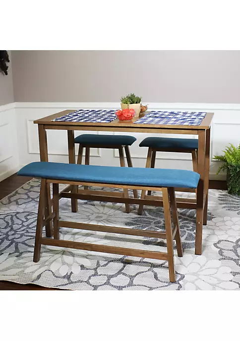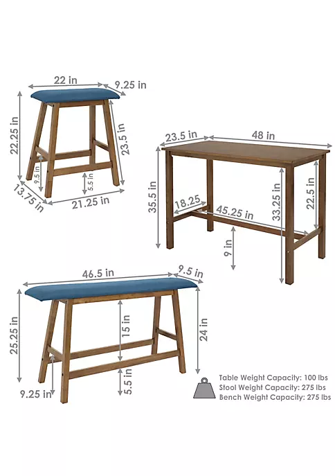 - SEATS 4 PEOPLE: This counter-height table with bench and stool set comfortably seats 4 people. The table measures 48″ W x 23.5″ D x 35.5″ H, weighs 37.4 lbs, and supports up to 100 lbs. Each stool measures 17.5″ W x 14″ D x 25″ H, weighs 9 lbs, and supports up to 275 lbs. The dining bench measures 42″ W x 14″ D x 25″ H, weighs 14.2 lbs, and supports up to 275 lbs.