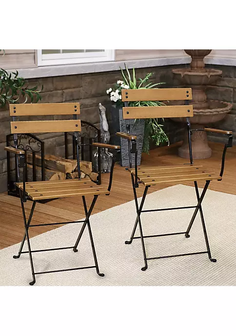 - PORTABLE, COMPACT FOLDING BISTRO CHAIR: 20.25 inches wide x 17.5 inches deep x 34.5 inches tall; Seat dimensions: 15.75 inches wide x 15.25 inches deep x 18.25 inches tall; Arms: 1.5 inch wide x 15.75 inches deep x 27 inches tall; Back: 15.75 inches wide x 17 inches tall; weighs 15.6 pounds per chair; Weight capacity: 400 pounds per chair