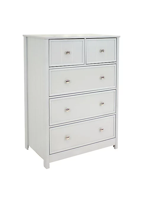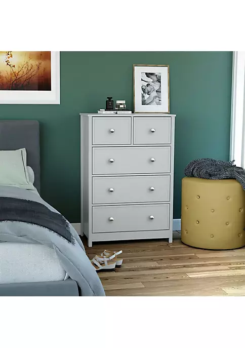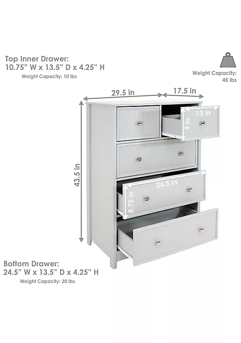 - AMPLE COMPACT STORAGE: Store a variety of items while saving living space with this tall bedroom dresser that measures 29.5″ W x 17.5″ D x 43.5″ H overall. The 2 smaller drawers have interior measurements of 10.75″ W x 13.5″ D x 4.25″ H, front dimensions of 13″ W x 1″ D x 9″ H, and a weight capacity of 10 lbs. The 3 larger drawers have interior measurements of 24.5″ W x 13.5″ D x 4.25″ H, front dimensions of 26.5″ W x 1″ D x 8.75″ H, and a weight capacity of 20 lbs. This dresser weighs 86.8 lbs.