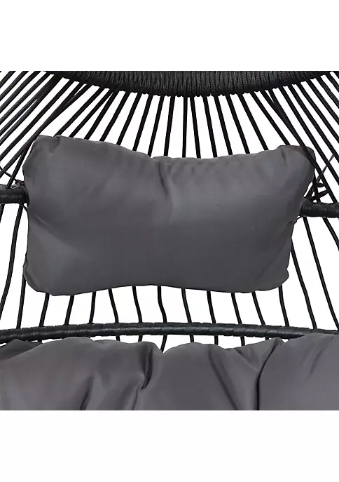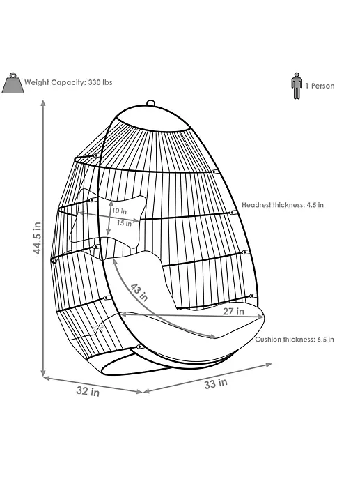 - RELAXING CLASSIC EGG CHAIR: Overall dimensions: 33 inches W x 32 inches D x 44.5 inches H; Flattened dimensions: 46 inches L x 33 inches W x 10 inches tall; Seat: 25 inches W x 21 inches D; Chain: 9 inches long; Cushion: 27 inches W x 43 inches deep x 6.5 inches thick; Headrest: 15 inches W x 10 inches tall x 4.5 inches thick; Weighs 24 pounds; Weight capacity: 330 pounds; This cozy egg chair provides a comfortable seating for 1 person