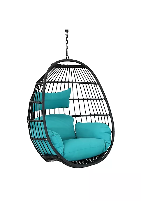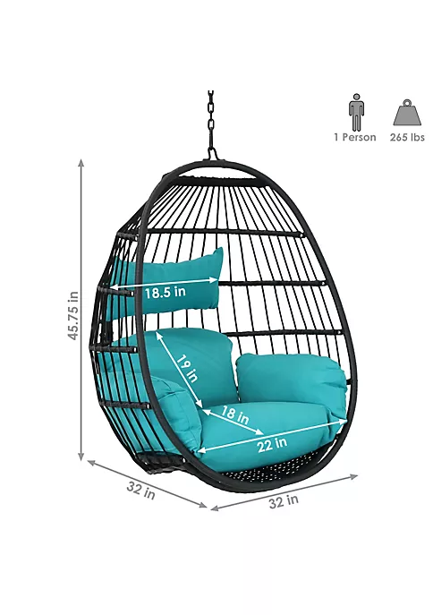 - CLASSIC EGG CHAIR: 32 inches wide x 32 inches deep x 45.75 inches tall (without chain) or 53 inches tall (with chain); Weighs 14 pounds; Weight capacity: 265 pounds; Headrest cushion: 18.5 inches wide x 10 inches tall x 4 inches thick; Overall seat cushion: 40 inches wide x 36 inches deep x 6 inches thick; Cushion back: 28 inches wide x 21 inches tall; Cushion seat: 22 inches wide (bottom) x 18 inches wide (top) x 18 inches deep; Cushion arms: 4 inches wide x 22 inches deep x 12 inches tall