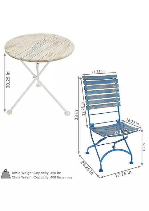 - PORTABLE, COMPACT FOLDING BISTRO SET: Overall chair measurements: 17.75 inches wide x 24.25 inches deep x 38 inches tall; Seat dimensions: 17.75 inches W x 16.25 inches x 18 inches tall;Weighs 20 pounds per chair; Weight capacity: 400 pounds per chair; Overall table measurements: 27.75 inch diameter x 30.25 inches tall; Weighs 20.2 lbs