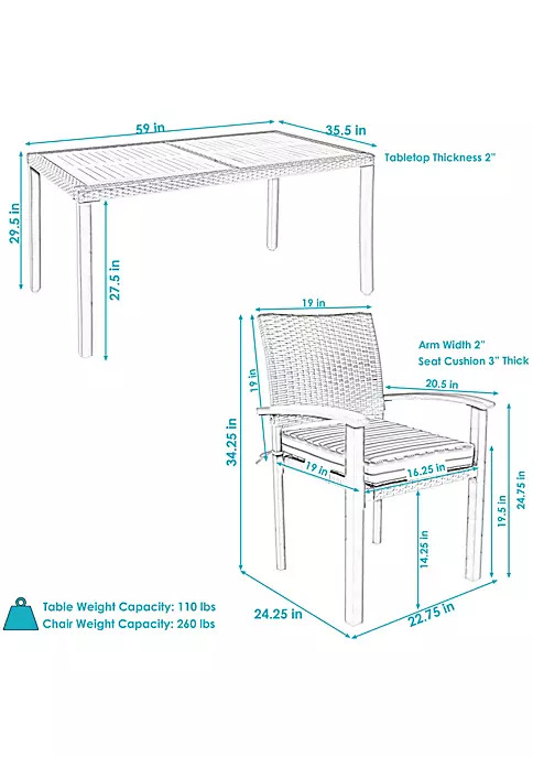 - STYLISH DINING: Dining set is perfect for the patio, deck, or yard to enjoy meals with your friends and family; Chair: 22.75″ W x 24.25″ D x 34.25″ H; Weighs 17.8 lbs; Weight capacity: 260 lbs; Dining table: 59″ W x 35.5″ D x 29.5″ H; Weighs 42.2 lbs; Weight capacity: 110 lbs