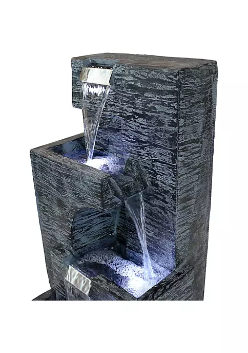 - PERFECT GARDEN FOUNTAIN: 15 inches wide x 14.25 inches deep x 32.25 inches tall; Weighs 29.8 pounds; Cord for the pump is 69 inches long; Cord for the LED lights is 74 inches long; Pump connects to a 0.5-inch diameter hose; Outdoor fountain has a recommended water capacity of 5 gallons; This backyard fountain is an ideal accent for any garden or patio
