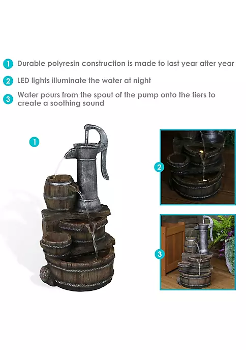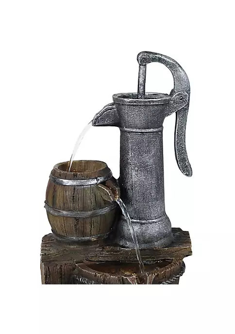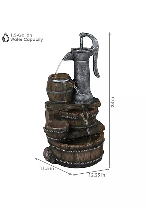 - PERFECT SIZE: Overall Dimensions: 12.25 inches W x 11.5 inches D x 23 inches tall; Weighs 9.2 lbs; Hose diameter: 0.5 inches; Electric cord length: 77 inches; Pump cord length: 59 inches; Water capacity: 1.5 gallons; This rustic backyard fountain is the perfect decorative accent for your patio, front porch, lawn or garden.
