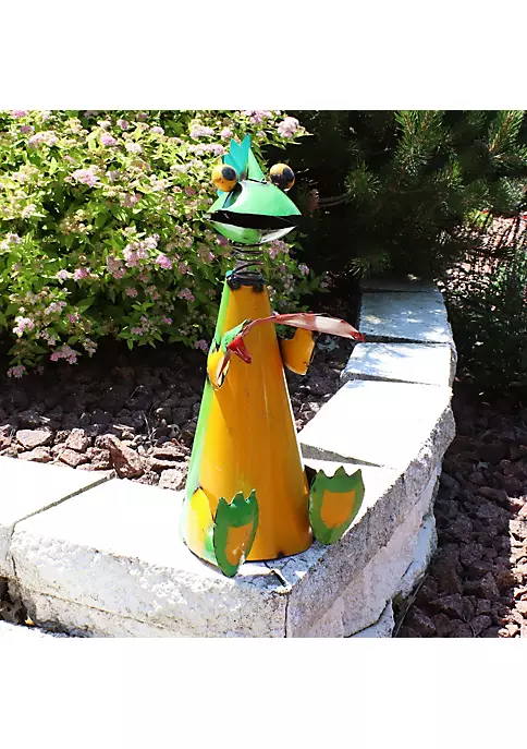 Add a childhood charm to your home with Diego the Dragon Steel Statue. This ferocious but friendly dragon statue is a whimsical way to greet your guests as they approach your front porch or come check out your garden. Diego is constructed of durable and hand-painted steel. The careful handcrafting of this product may result in minor modifications in design, shape, size, and color. Diego the Dragon holds a fish out to you as a peace offering and welcome gift as you approach him. The spring that makes his neck varies by height depending on the statue, but it adds character and a fun and unique detail to this statue. The colorful dragon statue is crafted for both indoor and outdoor use. Place this steel statue on the patio, deck, porch, sunroom, garden, living room, entryway, or anywhere in your home or yard. If used outdoors, this product will develop a natural patina over time.