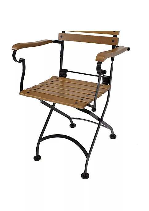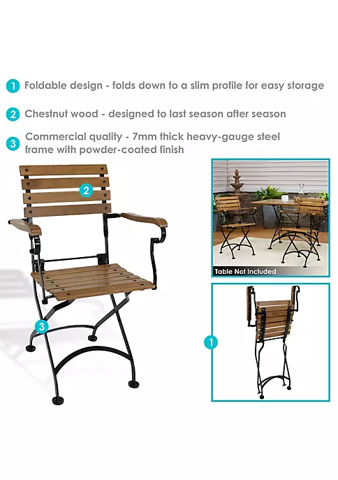 - PORTABLE, COMPACT FOLDING BISTRO CHAIR: 21.75 inches wide x 20 inches deep x 34 inches tall; Seat dimensions: 15.75 inches wide x 15 inches deep x 19 inches tall; Arms: 1.5 inch wide x 15 inches deep x 28 inches tall; Back: 15.75 inches x 18 inches tall; weighs 19.8 pounds per chair; Weight capacity: 400 pounds per chair