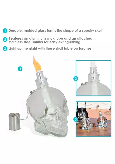 - TABLETOP CENTERPIECES: These stylish tabletop torches measure 3.5″ W x 4.75″ D x 6.75″ H and weigh 1 lb each. Each torch includes a 6.25″ L wick and is capable of holding up to 12 ounces of torch fuel.