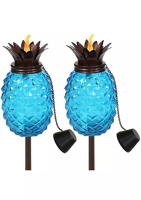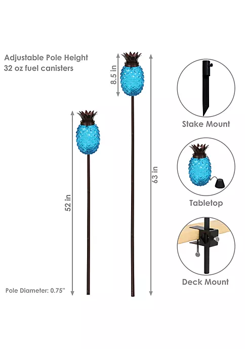 - PERFECT SIZE: These outdoor torches have a 5-inch diameter and are 63 inches tall (when assembled with all 4 pole sections); Weighs 4.2 lbs per torch; Pineapple vessel is 8.5″ tall; Pole Diameter: 0.75 inches; Fuel canister holds 32 ounces; Stands 52 inches tall when assembled with 3 pole sections