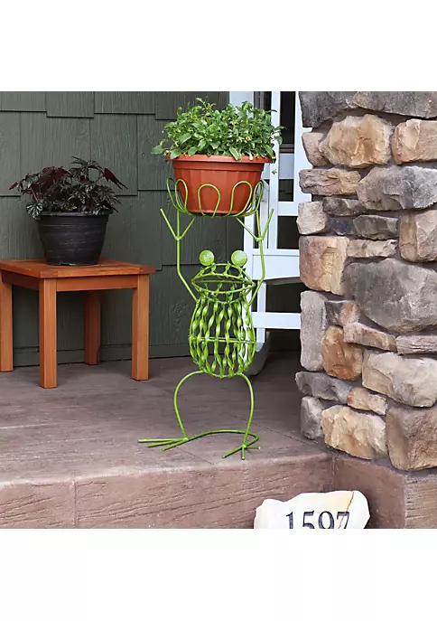 Add fun style and charm to the patio, living room, front porch, or sunroom with this unique frog plant stand. Made of durable steel, this creative plant stand features the appearance of a leaping frog. This sturdy plant stand can be used indoors or outdoors. If used outdoors, this rustic metal yard art will develop a natural patina over time. Because this item is handcrafted, the design and color may vary slightly.